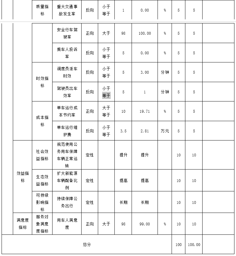 1.产出指标分为数量指标、质量指标、时效指标和成本指标,其得分为50分。安全行车公里,目标值大于900000公里,实际完成1337000公里; 安全出车次数,目标值大于25000趟次,实际完成37979趟次;安全行车教育及消防安全教育,目标值等于6次,实际完成14次;重大交通事故发生率0%;安全行车驾驶率100%;乘车人投诉率0%;调度员派车时效,目标值小于等于5分钟,实际完成3分钟;驾驶员出车效率,目标值小于等于5分钟,实际完成1分钟;单车运行成本节约率,目标值大于等于10%,实际完成19.71%;单车运行维护费,目标值小于等于3.5万元,实际完成2.81万元。