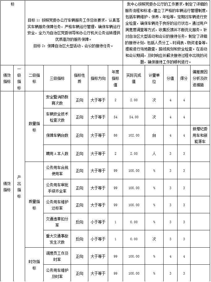 产出指标完成情况:1、数量指标,安全暨消防教育次数,目标值大于等于2次,实际完成2次;车辆安全技术检查次数,目标值大于等于54次,实际完成54次;保障车辆台数,目标值大于等于86台,实际完成102台;聘用A本人数,目标值大于等于2人,实际完成2人。2、质量指标,公务用车合规使用率,目标值大于等于99%,实际完成100%;公务用车审批手续齐全率,目标值大于等于99%,实际完成100%;公务用车维护达标率,目标值大于等于99%,实际完成100%;交通违章扣分率,目标值小于等于1%,实际完成0%;重大交通事故发生次数,目标值小于等于1%,实际完成0%。3、时效指标,调度员工作及时率,目标值大于等于99%,实际完成100%;公务用车维护及时率,目标值大于等于99%,实际完成100%;驾驶员任务完成及时率,目标值大于等于99%,实际完成100%。4、成本指标,公务用车使用年度经费总额,目标值小于等于414万元,实际完成347.56万元;单车运行成本节约率,目标值大于等于5%,实际完成2.8%。